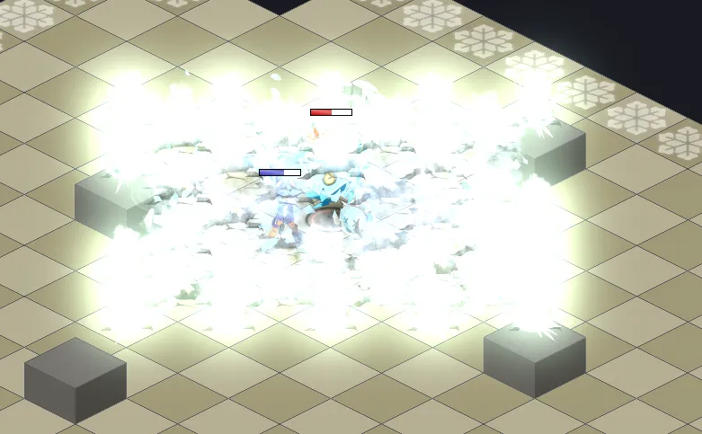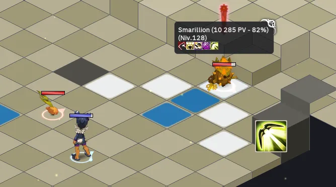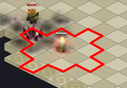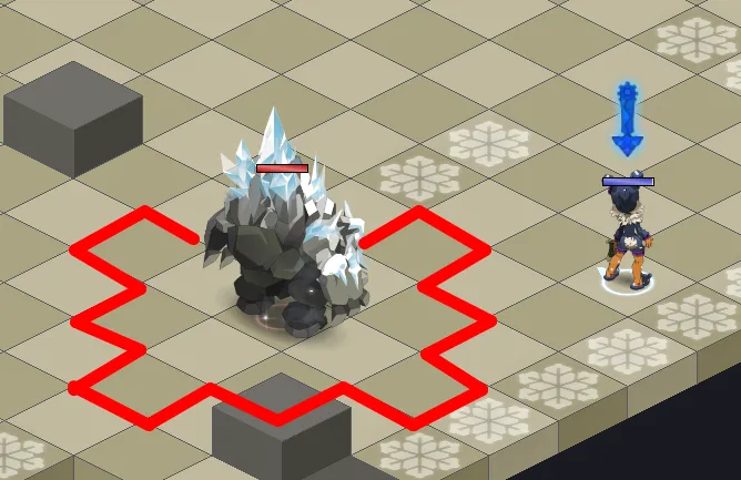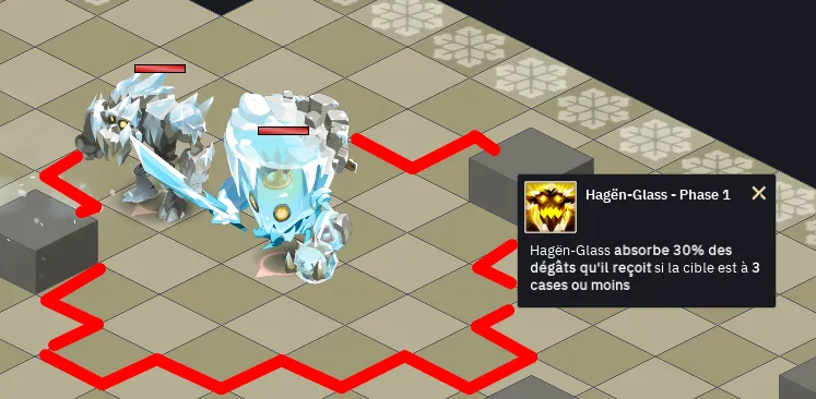 - Au début de la phase 2 et à chaque tour de jeu, le boss lance une grosse attaque en zone a 4 PO autour de lui qui applique de l’état congélation au niveau 4 directement : attention ! Évitez de vous approcher à moins de 5 cases du Boss et à moins de 3 du Crarte d’Or