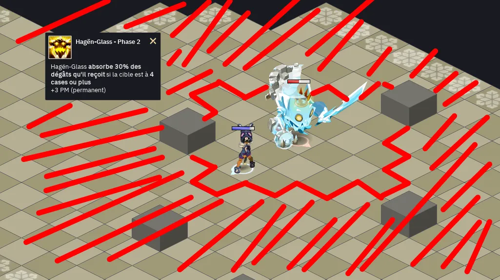 - Phase 2 : 50% PV à 0% PV : il absorbe 30% des dégâts subis à 4 cases ou plus