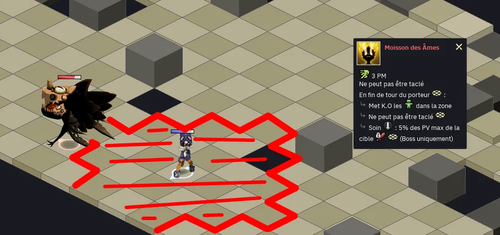 - Le boss va lancer « moisson des âmes » sur un de vos personnages : il deviendra alors intaclable, gagnera 3Pm mais à la fin de son tour, tuera tous les alliés situés à moins de 4 PO de lui : isolez-le