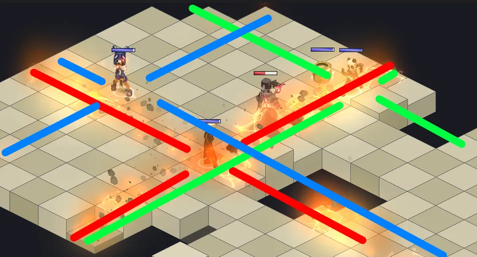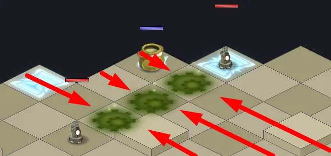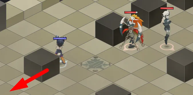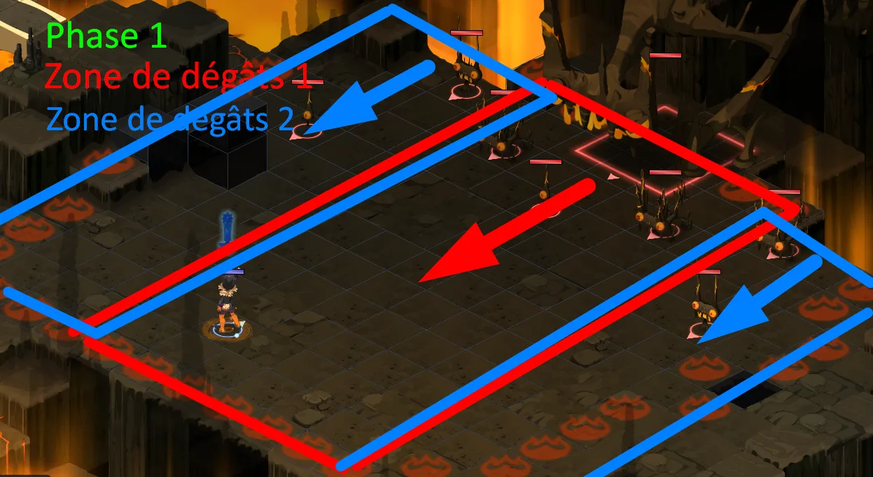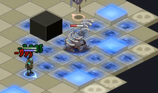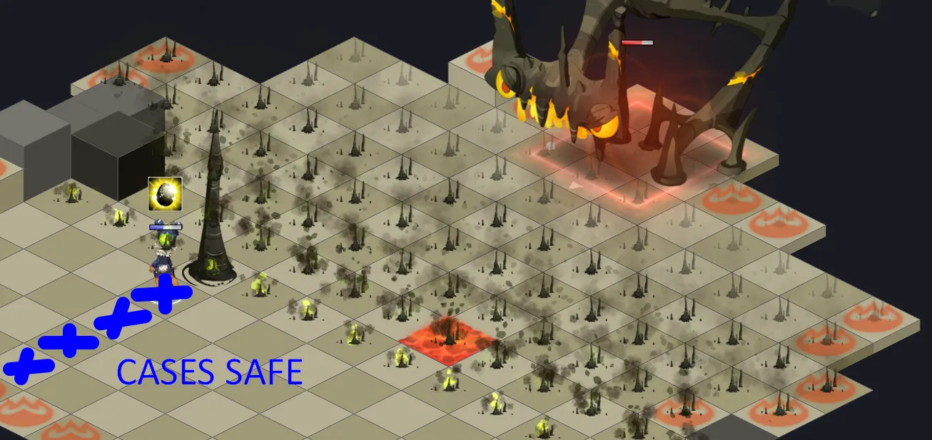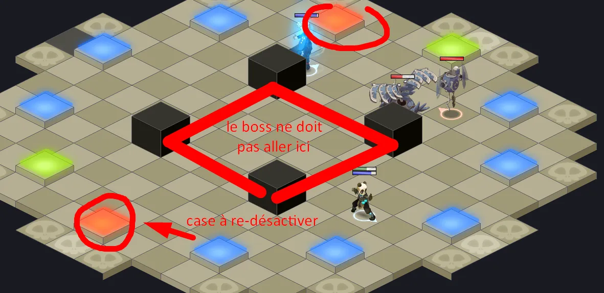 - Les cases rouges doivent être remise en bleues pour pouvoir taper sur le boss : il faudra à présent lancer un sort depuis ces cases rouges pour les faire passer en bleues