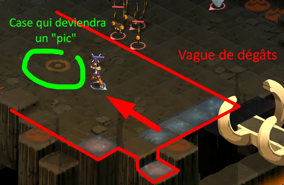 Quand un monstre meurt, il laisse un “pic” au sol : ce pic vous protègera des vagues de dégâts si vous êtes à gauche du “pic” (ça stoppe la vague pour tout le reste de la ligne en gros, les “pics” servent donc à vous protéger)