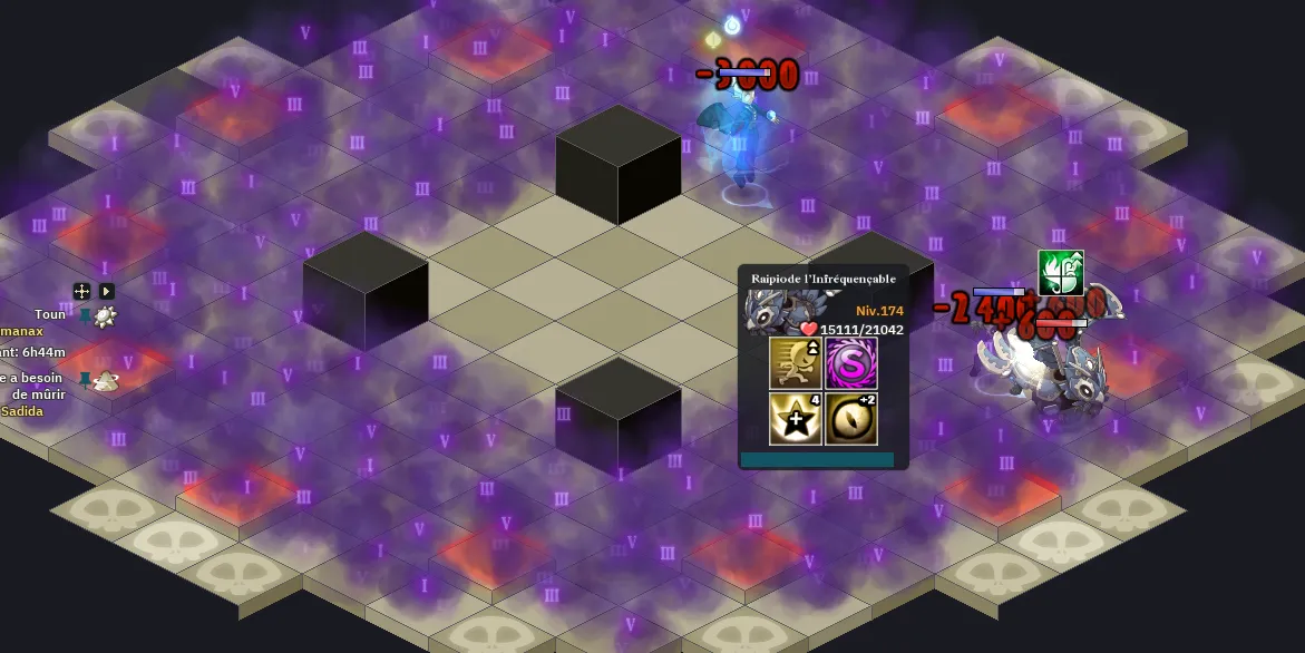 - 2 : L’état Rage du combat augmente ses dégâts et elle lancera à son tour un sort qui tape autour de chaque case de dégâts de la map (elle a 4 bras)