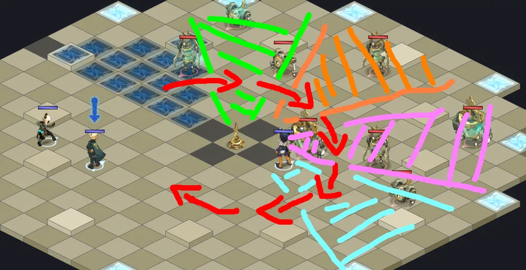 - Afin de pouvoir les éliminer facilement, il faudra que vos personnages “dégâts” commencent leurs tours sur le glyphe bleu foncé central, ce qui leur permettra d’augmenter de 50% leurs dégâts infligés pendant un tour et donc de pouvoir facilement éliminer toute la salle.