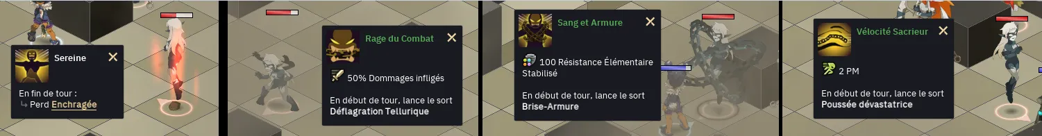 - 4 : L’état Vélocité Sacrieur augmentera ses PM et au début de son tour, elle repoussera tous vos personnages sur la map de 4 cases par rapport à sa position, c’est probablement l’état le plus dangereux à surveiller pour éviter de prendre des cases de morts (vous pouvez vous coller à un bloc pour éviter d’être poussé)