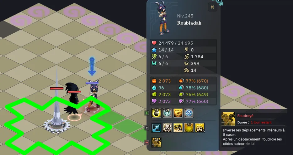 - Il vous faudra tout d’abord avoir un personnage qui commence à 2 PO maximum du Cadran centrale de la map pour obtenir l’état “Foudroyé”