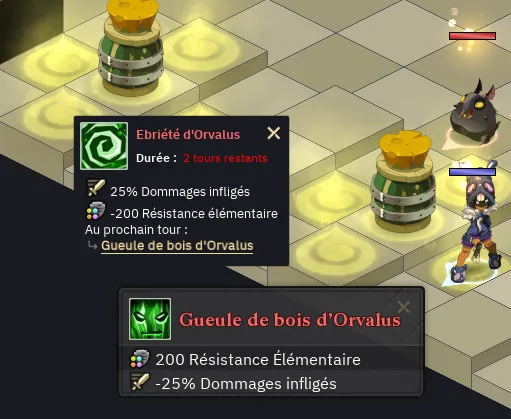 Le tour d’après avoir subi le glyphe tonneau, l’effet s’inverse : il perd des dégâts mais gagne des résistances : les monstres (et joueurs) auront alors une aura verdâtre : Préférez dépenser vos PA sur d’autres monstres