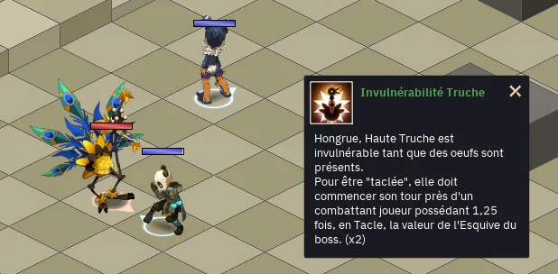 Les œufs sont invulnérables également tant que le boss ne s’est pas fait tacler : Mettez un personnage avec beaucoup de tacle au corps à corps du boss le plus vite possible (vers les 500 de tacle minimum)