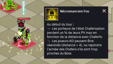 Le boss n’est pas invulnérable mais il restera bloqué à 1PV pour vous faire un tour final destructeur, votre but est seulement de rester en vie avec au moins un personnage à la fin de son tour puis le combat se terminera : pensez à bien séparer les joueurs encore restant en vie pour éviter les gros sorts de zones du boss