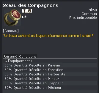 De plus, pour optimiser la quantité de récoltes, il est intéressant de commencer par monter tous les métiers de récolte du jeu lvl 100 afin d’obtenir le sceau des compagnons, un anneau qui vous est offert dès que cet objectif est atteint et qui vous permet de générer beaucoup plus de ressources rares pour la suite !