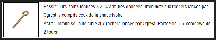 - Si vous avez un personnage soins : il prendra la BAGUETTE RIKIKI pour augmenter son soin. Son rôle sera d’être attentif aux rochers lancés par Ogrest (phase Ivoire) pour éviter les OS avec l’actif de son artefact